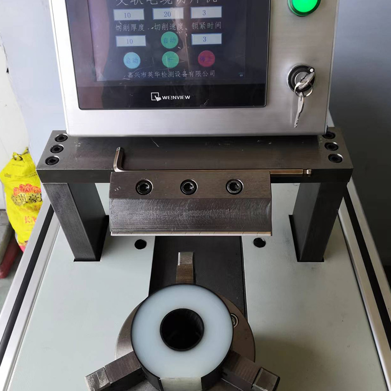This machine can perform axial and longitudinal cutting on cable samples to obtain high-quality slices with different thicknesses of 0.1~2mm for testing purposes. Users must carefully read this user manual and relevant chapters in national standards such as GB11017, GB12705, and GB2951 to master the relevant test methods and steps, in order to successfully complete this test project. This machine adopts touch screen, PLC The stepper motor drives the sample holder to move to complete the cutting stroke (the cutting speed can be set arbitrarily on the touch screen). The cutting thickness is controlled by the stepper motor driving the sample holder to move up and down, (The cutting thickness can be directly input on the touch screen. If the thickness is the same as last time, it can be set without pressing the start button. The machine will automatically open the locking device, adjust the set cutting thickness, lock the locking device, start the cutting workbench, start cutting, and automatically return to the starting position after the cutting is completed. After the work is completed, the machine will stop by default. If you still need to continue cutting pieces of the same degree, press the start button.) Yes The rotation of two sets of fixtures can complete the holding of transverse and longitudinal specimens. Our company ensures the manufacturing process with high-precision manufacturing processes to obtain high-quality sample slices